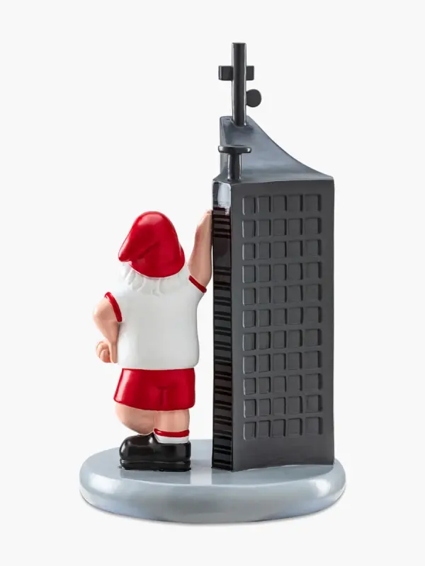 - Farbenfrohe Gartendekoration mit einem klassischen Gartenzwerg, der an der City-Hochhaus Leipzig (Uniriese) lehnt